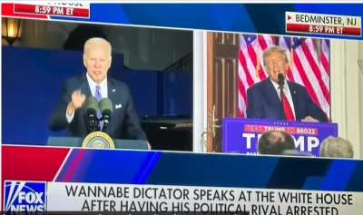 "Dictatorul în devenire vorbeşte la Casa Albă după ce a arestat un rival politic”, a scris pe ecran Fox News, cu puţin înainte de ora 21.00 marţi seara (01.00 GMT miercuri), difuzând imagini cu Joe Biden, care vorbea de la preşedinţie, şi cu Donald Trump în faţa susţinătorilor săi, de pe unul dintre terenurile sale de golf din New Jersey.