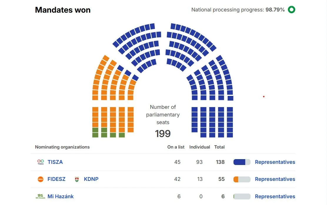 Dacă rezultatele parțiale rămân neschimbate, partidul TISZA, conservator și pro-european, condus de Peter Magyar (45 de ani, foto jos), va ocupa 138 de mandate din cele 199 de mandate ale Adunării Naționale, adică o majoritate de două treimi. FIDESZ ar urma să ocupe doar 53 de mandate.