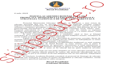 În plus, introducerea amintitei Strategii ar agrava şi mai mult situaţia disperată a copiilor fără părinţi, care ar urma să fie educați într-un spirit inadecvat nevoilor noastre sociale. Publicaţiile mai mult sau mai puţin ştiinţifice pe tema educaţiei parentale sunt, fireşte, libere să exprime diferite puncte de vedere, dar ipotezele educaţionale aşa-zis „moderniste“ nu pot şi nu trebuie să devină obligatorii într-un stat naţional, independent şi democratic. În concluzie Academia Română consideră că proiectul de Strategie de educaţie parentală este inoportun şi inadecvat pentru învăţământul şi educaţia românilor, meniți să-și conserve specificul național în cadru european", se arata intr-un comunicat al Academiei Romane.