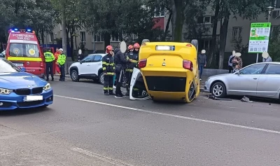 "Accident grav pe Racoviță în Berceni, taxi răsturnat V** la număr, ceva persoane rănite pe trotuar."