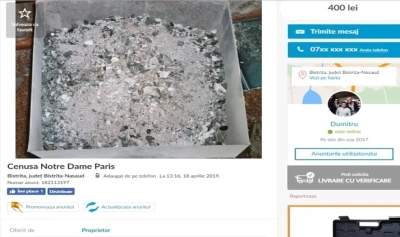 O persoană vinde 280 de grame de „censa de la Catedrala Notre-Dame” pentru 400 de lei, iar un altul vinde „Lemn ars de la Notre Dam Paris” pentru 500 de lei.