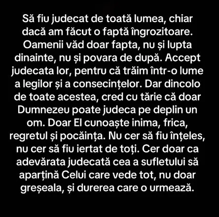 „Să fiu judecat de toată lumea, chiar dacă am făcut o faptă îngrozitoare. Oamenii văd doar fapta, nu şi lupta dinainte, nu şi povara de după. Accept judecata lor, pentru că trăim într-o lume a legilor şi a consecinţelor. Dar dincolo de toate acestea, cred cu tărie că doar Dumnezeu poate judeca pe deplin un om. Doar El cunoaşte inima, frica, regretul şi pocăinţa. Nu cer să fiu înţeles, nu cer să fiu iertat de toţi. Cer doar ca adevărata judecată cea a sufletului să aparţină Celui care vede tot, nu doar greşeala, şi durerea care o urmează.”