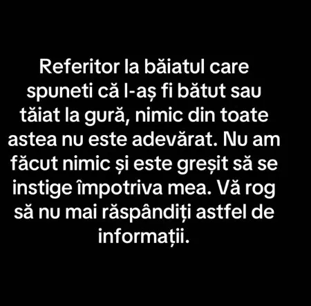 „Referitor la băiatul care spuneti că l-aş fi bătut sau tăiat la gură, nimic din toate astea nu este adevărat. Nu am făcut nimic şi este greşit să se instige împotriva mea. Vă rog să nu mai răspăndiţi astfel de informatii.”