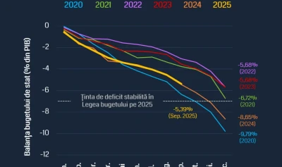 Deficitul bugetar al României s-a adâncit constant în primele nouă luni din 2025, graficul evoluției lunare a balanței bugetului de stat pe metoda cash arătând o scădere în același ritm alarmant ca în 2024 și mult mai rapid decât în anii 2021-2023. În aceste condiții, ținta inițială de 7% din PIB convenită cu Comisia Europeană devine aproape imposibil de atins, chiar dacă impactul principal al măsurilor fiscale este așteptat abia în trimestrul al patrulea, consideră specialiștii Romanian Economic Monitor (RoEM)-UBB FSEGA, proiect de cercetare al Facultății de Științe Economice și Gestiunea Afacerilor (FSEGA) din cadrul Universității Babeș-Bolyai (UBB) din Cluj-Napoca.