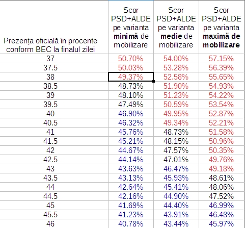Scorul e o fracție care depinde de numărător (câte voturi obțin PSD+ALDE, adică cele trei variante listate mai sus) și de numitor (prezența). Luând în calcul și cele 2,4% din totalul prezenței care se concretizează în voturi nule, rezultă graficul următor. Dacă "te rătăcești" în el sau nu-ți prea plac tabelele de fel, încearcă să urmărești doar a treia coloana (varianta medie de mobilizare), aceea fiind probabil cea mai apropiată de ce se va întâmpla în ziua votului: