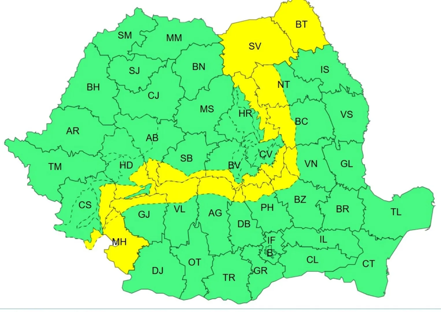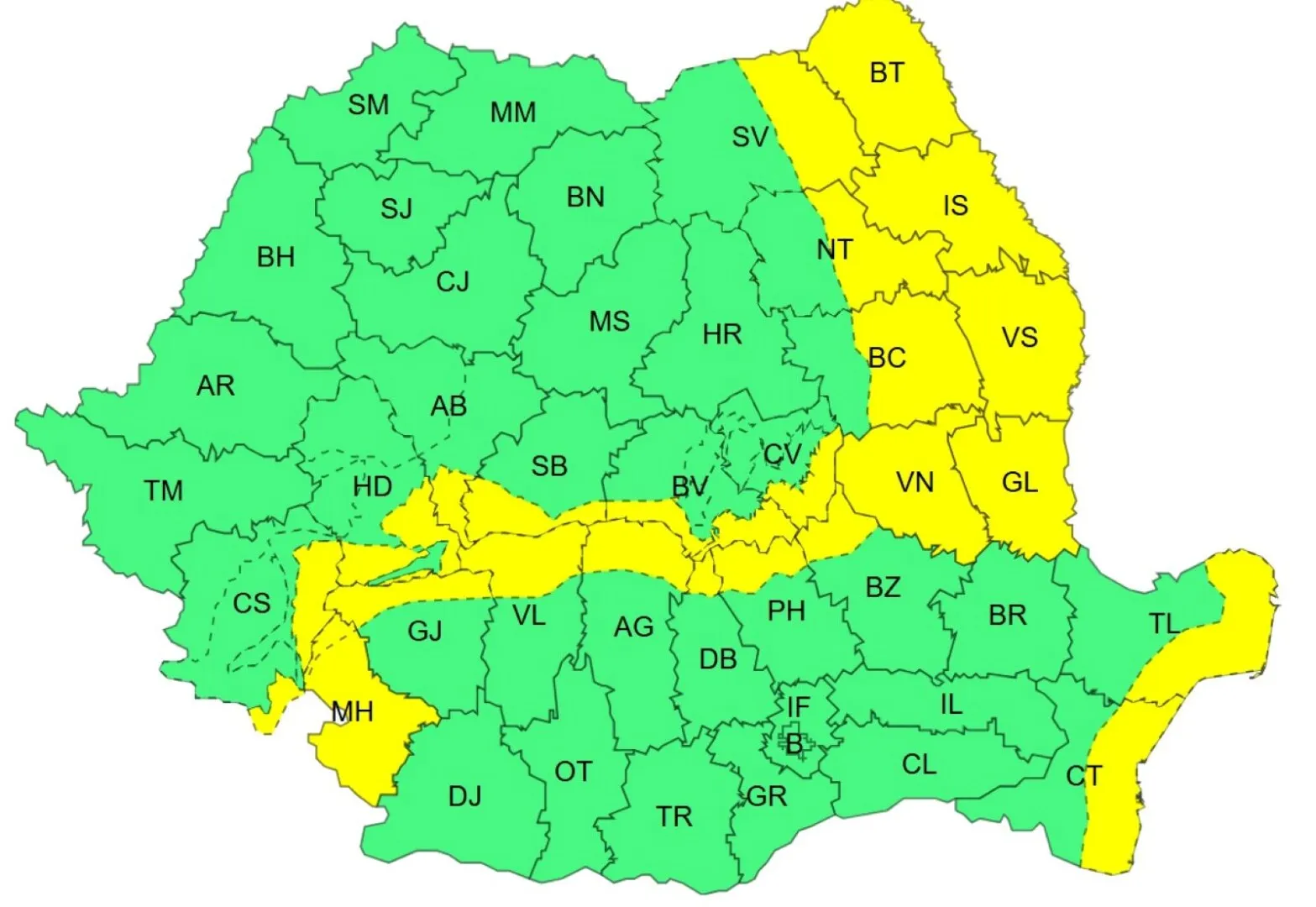 Prima avertizare Cod galben este valabilă în intervalul vineri, ora 14 - sâmbătă, ora 16. Temporar, vântul va avea intensificări în cea mai mare parte a Moldovei, în vestul Olteniei și pe litoral, cu viteze de 50-70 km/h. În Carpații Meridionali și de Curbură vor fi rafale de 70-80 km/h, iar în zona înaltă de 90-120 km/h, viscolind zăpada depusă.