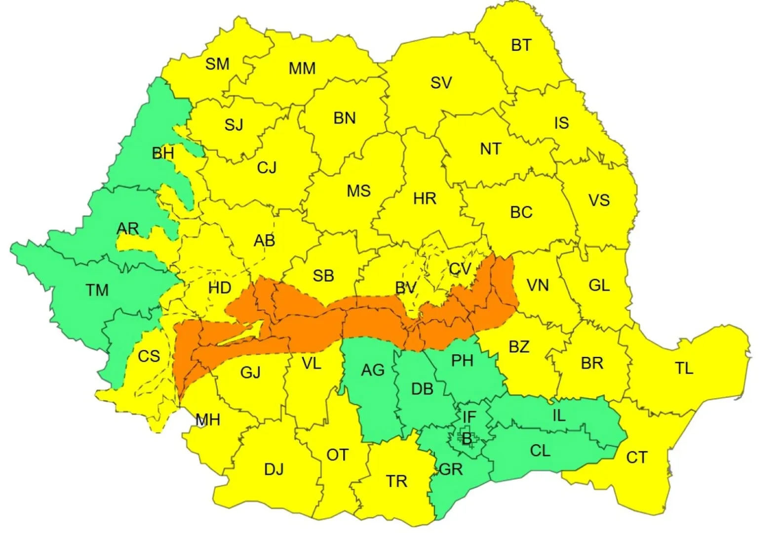 Cea mai severă avertizare este de tip Cod portocaliu, valabilă de duminică, ora 2.00, până luni, ora 10. În zona înaltă a Carpaților Meridionali și de Curbură, vântul va sufla tare cu rafale de peste 110-130 km/h. Va ninge viscolit, vizibilitatea va fi foarte redusă, iar zăpada va fi troienită.