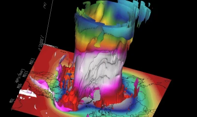 Mai jos, puteți vedea o imagine tridimensională a vortexului polar. Axa verticală este mult îmbunătățită pentru o mai bună prezentare vizuală. În acest fel, puteți vedea foarte bine structura reală a vortexului polar și modul în care acesta este conectat la nivelurile inferioare și la sistemele de presiune.