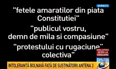 Jurnalistul Radu Tudor a anuntat duminica seara ca Antena 3 va reclama la CNCD doi jurnalisti, Dan Tăpălagă (Hotnews) și Mălin Bot (Evenimentul zilei), pentru afirmatiile acestora in legatura cu manifestatia organizata de trustul Intact in Piata Constitutiei.