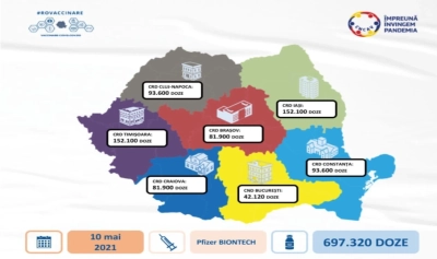 Mâine, 10 mai, România va primi o nouă tranșă de vaccin de la compania Pfizer BioNTech, care constă în 697.320 doze. Vaccinurile vor fi livrate pe cale aeriană și vor ajunge pe aeroporturile din Otopeni, Cluj-Napoca și Timișoara. Totodată, o parte din tranșa aferentă Centrului Regional Timișoara va sosi pe cale terestră.