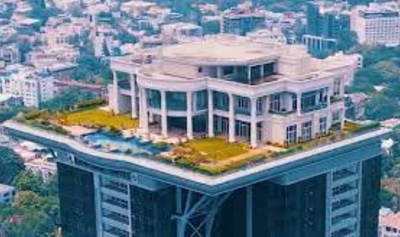Situat deasupra unui complex de apartamente de lux cu 33 de etaje din Bengaluru, India, acest „conac din cer” are în jur de 4000 de metri pătrați, două etaje, un heliport, grădini luxuriante, o piscină infinită și o punte de vizionare la 360 de grade.