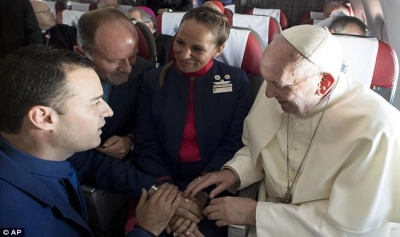 „Nu ne vine să credem că Papa ne-a căsătorit”, le-a spus Ciuffardi colegilor şi reporterilor din avion. „Un papă nu a căsătorit niciodată pe cineva în avion. Avem un documentar de la Vatican, este valid”.