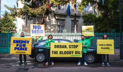 "Prim ministrul maghiar, Viktor Orbán, împiedică acţiunea comună a UE împotriva agresiunii Rusiei, argumentând că ar presupune un cost ridicat pentru economia ţării. Greenpeace cere guvernului maghiar să-şi dedice toate resursele pentru a reduce consumul de petrol fără să blocheze o acţiune de grup, europeană, care ar putea aduce pacea în viitorul apropiat. Guvernul Ungariei se opune ferm embargoului, refuzând să facă orice efort pentru a-şi reduce dependenţa de petrolul rusesc şi delimitându-se de celelalte ţări ale Uniunii Europene care consideră că un embargo asupra petrolului rusesc poate opri mai repede războiul pornit de Vladimir Putin în Ucraina.