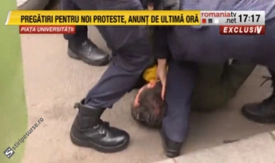 Scene șocante, luni după-amiaza, în Piața Universității din București! Un tânăr a fost extras dintr-o mulțime ce protestează în centrul Bucureștiului și a fost trântit la pământ, cu forța. Cinci jandarmi s-au urcat pe el și l-au încătușat, apoi l-au urcat în dubă.