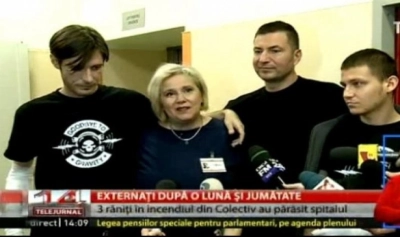 Au fost externați trei dintre răniții din Clubul Colectiv. "Nu suntem satanişti, iar după ce ne facem bine vrem să ne reîntalnim cu toţii în cadrul unei mari reuniuni", au spus ei înainte să plece de la Spitalul Bagdasar Arseni din Capitală.