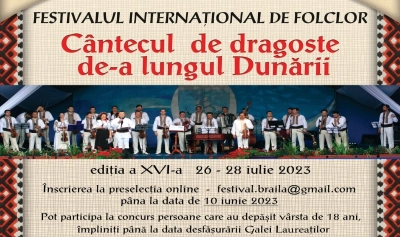 Festivalul internaţional de folclor "Cântecul de dragoste de-a lungul Dunării", ajuns la ediţia a XVI-a, este programat în perioada 26-28 iulie, pe scena de pe Esplanada Dunării, în organizarea Consiliului Judeţean Brăila, a Primăriei Municipiului şi a CJCPCT.