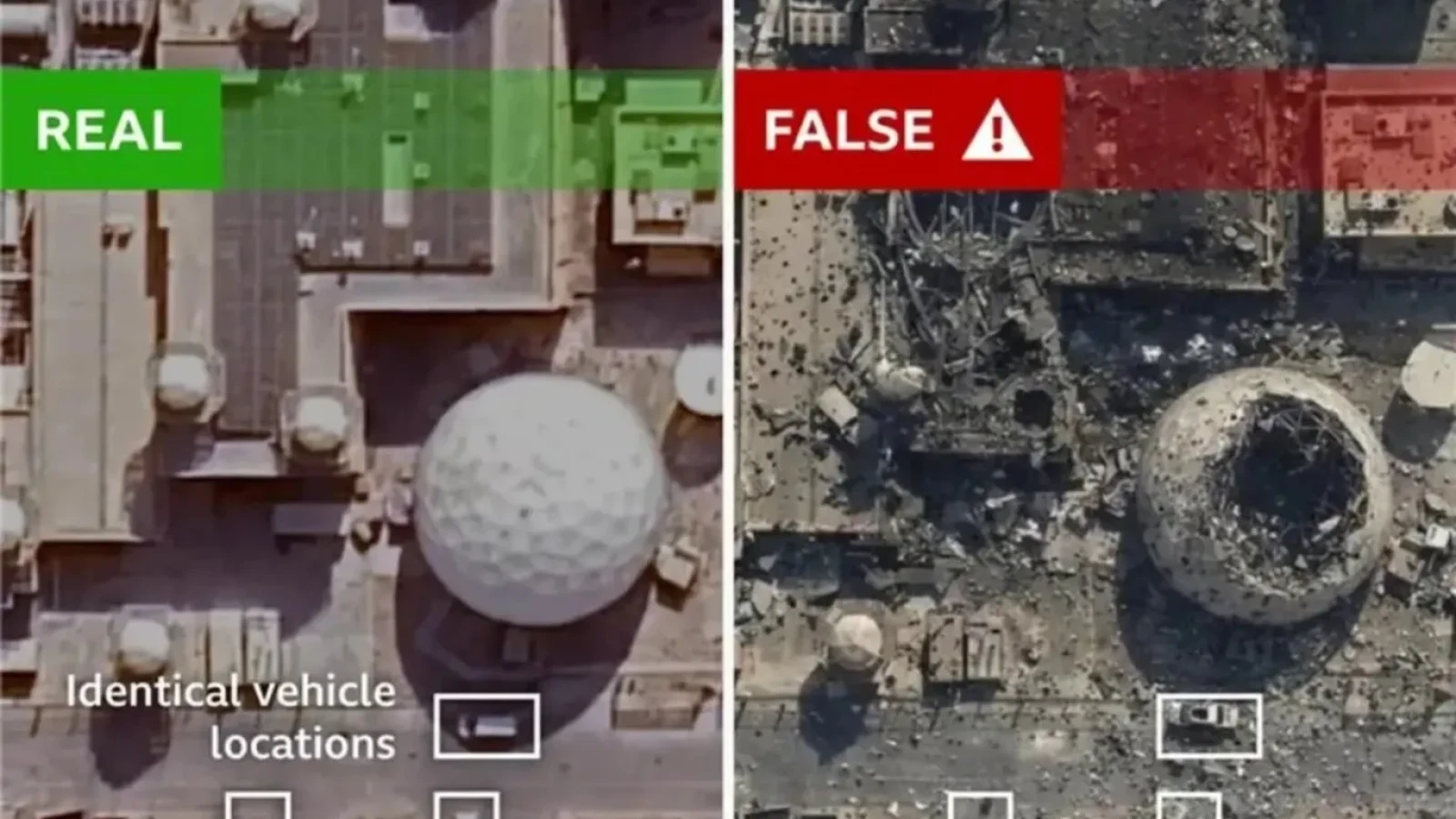 BBC Verify a identificat și imagini satelitare generate de AI, inclusiv o fotografie falsă distribuită de publicația iraniană The Tehran Times, care pretindea să arate distrugeri masive la baza Flotei a Cincea a SUA din Bahrain. Detectorul Google SynthID a confirmat că imaginea a fost generată sau editată cu un instrument AI.