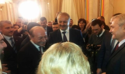 Vicepremierul Liviu Dragnea, prezent, luni, la recepţia de la Palatul Cotroceni, de Ziua Naţională, l-a aşteptat pe preşedintele în exercițiu Traian Băsescu, în timp ce acesta se fotografia cu invitaţii, iar la finalul evenimentului a făcut o poză cu şeful statului, cei doi retrăgându-se, împreună, din Sala Unirii.