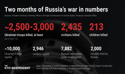 Publicația The Kiev Independent, care citează cifre oficiale ale Kievului, publică un bilanț al celor două luni de război în Ucraina.