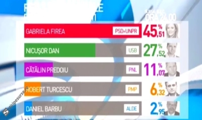 Au apărut primele rezultate oficiale de la Biroul Electoral Central. Gabriela Firea de la PSD are 45,5%, Nicusor Dan de la USB are 27,5, iar Cătălin Predoiu de la PNL are 11%. Robert Turcescu de la PMP are 6,3%.