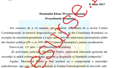 În cursul zilei de astăzi, 8 iunie 2017, procurorul general al Parchetului de pe lângă Înalta Curte de Casaţie şi Justiţie, Augustin Lazăr, a transmis scrisori președintelui României, președintelui Înaltei Curte de Casație și Justiție, precum și Avocatului Poporului, în vederea sesizării Curții Constituţionale, în temeiul dispoziţiilor art. 146 lit. a) din Constituţia României cu excepţia de neconstituţionalitate a Legii cadru privind salarizarea personalului plătit din fonduri publice.