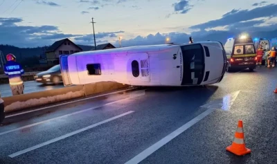 Accidentul s-a produs marți dimineață în localitatea Veștem. Potrivit ISU Sibiu, din informațiile preliminare, în evenimentul rutier sunt implicate 12 persoane, 11 dintre acestea în microbuz.