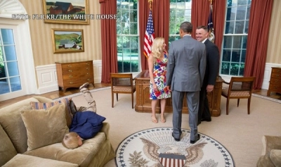 Fotograful Casei Albe Lawrence Jackson a surprins momentul in iunie anul acesta. Amuzati probabil de imagini, membrii staff-ului de PR al presedntelui au postat, marti, pe contul oficial de Flickr al Casei Albe fotografiile, anunță stirileprotv.ro