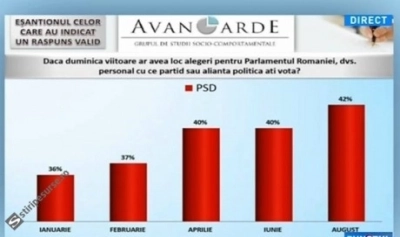 Conform aceluiași sondaj, în luna august 42% dintre români ar fi votat cu PSD dacă ar fi fost alegeri parlamentare.