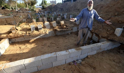 Jellaba sa neagră este pusă în pantaloni, care erau bej înainte să fie plini de nisip şi de praful pe care le ridică în fiecare zi. ”Cimitirul este atât de plin, încât acum săpăm gropi peste gropi, am pus morţii în etaje”, declară cel care a văzut ”toate războaiele din (Fâşia) Gaza”, dar care ”n-a văzut niciodată aşa ceva”.
