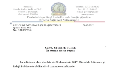 "La solicitarea dvs. din data de 08 decembrie 2017, Biroul de Informare şi Relaţii Publice este abilitat să vă comunice următoarele: În acest moment, informațiile solicitate nu fac obiectul comunicării publice, fiindu-le incidente prevederile art. 12, alin. 1, lit. e) din Legea 544/2001", se arată în răspunsul DNA.