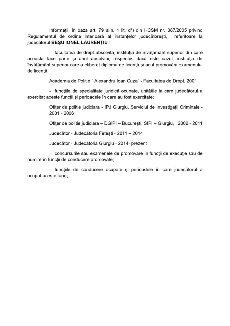 „Conform unui document oficial, Laurențiu Beșu nu a prestat nicio zi de activitate de poliție judiciară pe perioada în care a lucrat la structura «Doi și-un sfert»”, a spus Ciutacu. Magistratul nu ar fi îndeplinit pragul minim de cinci ani cerut de lege pentru accederea în magistratură pe filiera „poliție judiciară”.
