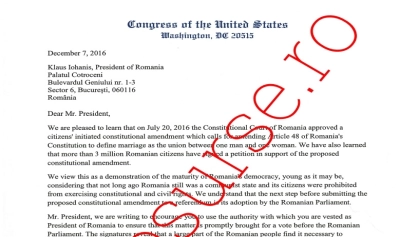 Președintele Klaus Iohannis a primit o scrisoare din partea Congresului SUA, semnată de 13 parlamentari republicani, prin care este îndemnat să se asigure că demersul Coaliției pentru Familie de modificare a Constituției își urmează cu rapiditate pașii legali.