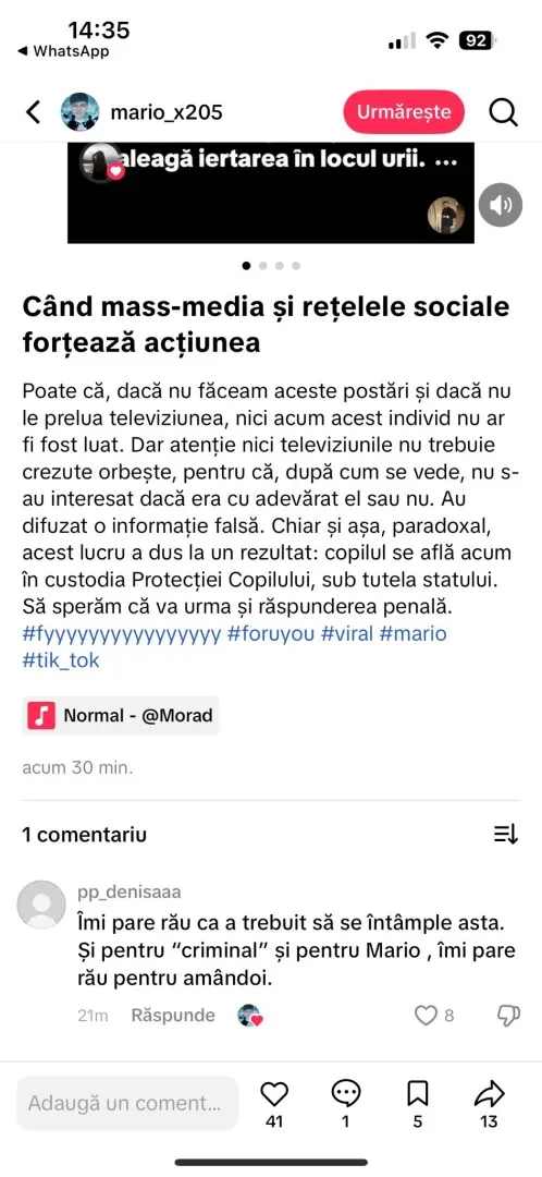 Situație halucinantă în Timiș. După ce criminalul de 13 ani de la Cenei a fost lăsat liber după audieri, un cont de Tik Tok a fost creat în numele lui. Pe contul respectiv s-au postat imagini cu texte în care presupusul criminal ba își cerea scuze, ba posta videoclipuri sfidătoare și mai amenința cu o crimă.