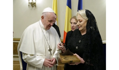 Sanctitatea Sa Papa Francisc s-a întâlnit vineri, la Palatul Cotroceni, cu premierul Viorica Dăncilă. Premierul Viorica Dăncilă i-a dăruit acestuia un ceas făcut de un român. Pe cadran este reprezentat Sfântul Francisc de Assisi inspirat dintr-o frescă de a marelui pictor Giotto.