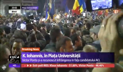 Klaus Iohannis a ajuns în Piața Universității unde a fost aplaudat de mii de oameni. Dacă Iohannis a fost aplaudat, manifestanții i-au cerut demisia lui Victor Ponta.