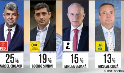 Dacă duminica viitoare ar avea loc alegeri prezidenţiale, 25% dintre românii intervievaţi în cadrul sondajului Sociopol l-ar vota pe Marcel Ciolacu. La distanţă de 6 procente de locul 1 se situează George Simion, cu 19% în intenţia de vot.
