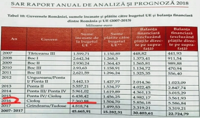 Dacian Cioloş, premierul din noiembrie 2015 - ianuarie 2017, combate ideea că guvernul condus de el nu a absorbit fonduri europene. Face însă acest lucru prezentând datele despre sumele încasate pe exerciţiul 2007-2013 în mandatul său, pentru care, practic, nu are niciun merit. Ceele 7 miliarde de euro menţionate reprezentau deconturi pentru proiectele depuse în timpul guvernărilor anterioare.