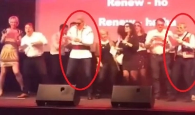 Unii dintre europarlamentarii Alianței, prezenți pe scenă poartă ochelari de soare, iar scopul momentului artistic pare a fi promovarea culturii pop românești și a portului național.