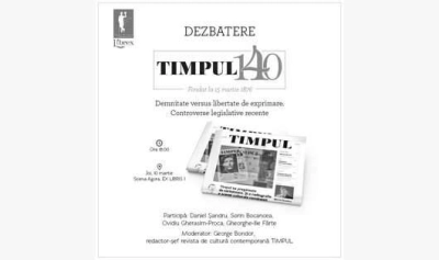Joi, 10 martie 2016, începând cu ora 18:00, în cadrul Târgului de Carte LIBREX, care se desfășoară la Palas Mall Iași, Asociația revistei TIMPUL vă invită să participați la dezbaterea Demnitate versus libertate de exprimare. Controverse legislative recente.