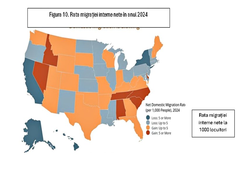 Migrația internă a modelat și ea în timp așezarea populației pe teritoriul țării, alături de marea imigrație internațională. Un studiu al Bank of America Institute din ianuarie 2026 [8.1.] indică un regres considerabil al migrației interne. După anul 2021 numărul celor care și-au schimbat reședința s-a redus la jumătate. Motivația migrării este legată de costuri (să fie un pic mai bine) și climă. De ici și fluxurile spre statele din sud, spre soarele din „Sun-Belt”. Numărul celor plecați în alte state sau în MSA (Metropolitan Statisticul Areas) s-a redus în raport cu cei care au migrat în aceeași regiune. Proporția populației trăind în locuințe închiriate este de 35 la sută în SUA. În România este de 94 la sută (cel mai ridicat nivel în UE-27). Se apreciază că la o populație care locuiește cu chirie în mare proporție, migrația internă este favorizată, mai ridicată, ceea ce are efecte economice pozitive. Ratele migrației interne nete între state (în figura 10) au valorile pozitive cele mai ridicate, în statele colorate galben (până la 5%) și îndeosebi în cele colorate maro (5% și peste). Pare surprinzătoare proporția mică din California.