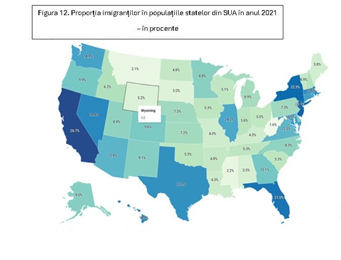 Figura 12. Proporția imigranților în populațiile statelor din SUA în anul 2021 (https://www.pewresearch.org/race-and-ethnicity/2020/08/20/facts-on-u-s-immigrants/).