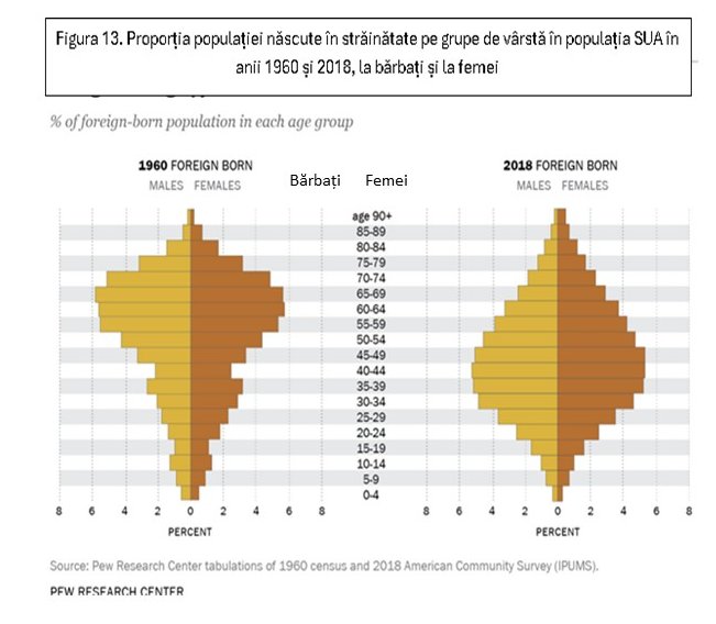 Figura 13. Proporția populației născute în străinătate pe grupe de vârstă în populația SUA în anii 1960 și 2018, la bărbați și la femei (https://www.pewresearch.org/race-and-ethnicity/2020/08/20/facts-on-u-s-immigrants/).