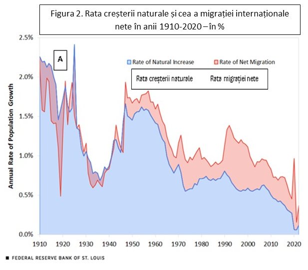 Unde a fost motorul creșterii susținute a populației? În migrația externă. În figura 2 pot fi examinate contribuțiile  spectaculoase ale creșterii  naturale și ale migrației nete, ca rate, la  creșterea populației în perioada 1910-2020.  Regresul masiv al natalități între 1920 și 1950, în zona A, este rezultatul unui cumul de factori și circumstanțe, Marea Depresiune din anii 1920-1930, începuturile modernizării agriculturii și  reducerea în timp  numărul de copii ca forță de muncă în gospodărie, răspândirea  preocupărilor de planificare familială   pentru reducerea  dimensiunii familiei, participarea crescândă a femeii la activități economice în afara gospodăriei, legislație restrictivă asupra imigrației în anii 1920. În figura 3 se pot vedea evoluțiile natalității și mortalității într-o foarte lungă perioadă de timp, 1870-2025. Putem înțelege mai bine manifestările natalității și mortalității din perioade mai mici dacă le plasăm în acest cadru istoric de mare întindere. Evoluțiile sunt proprii modernizării țării din a doua jumătate a secolului al 19-lea, în întregul secol al 20-lea și în primele trei decenii din acest secol. Creșterea mortalității înainte de anul 1920, în zona A, a provenit din efectele teribilei gripe Spaniolă în anii 1918-1920 și prin pierderile umane din Primul Război Mondial. Regresul masiv al natalității în zona B a avut loc în anii Marii Crize care a lovit SUA în prima parte a anilor anii 1930. Se observă, în zona C, recrudescența mortalității în anii Pandemiei Covid-19.