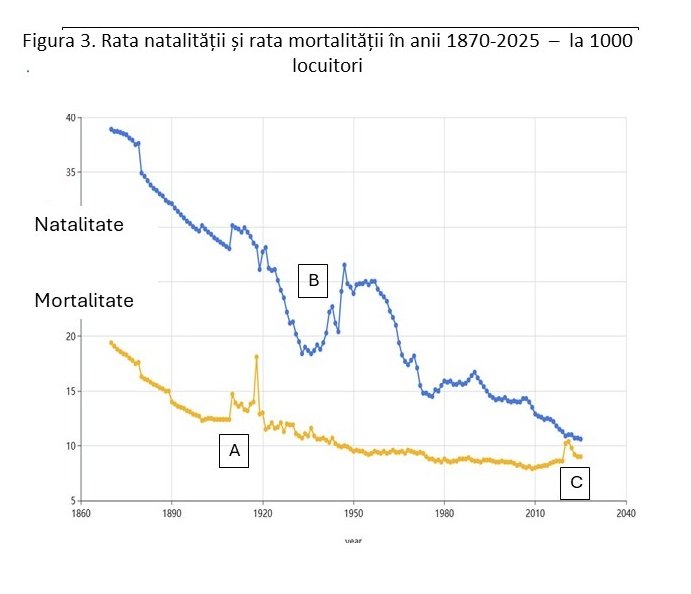 Figura 3. Evoluția ratei natalității și mortalității în perioada 1860-2025