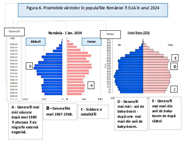 Prezentarea structurii pe sexe și vârste are marele avantaj al folosirii piramidelor vârstelor pentru SUA și România în figura 6. Se pot astfel  identifica mai mulți factori care pot afecta această structură fundamentală din mai multe perspective: demografică, prin evidențierea procesului de îmbătrânire demografică, dimensiunea populației feminine în vârstă de 15-49 ani, care aduce pe lume copii țării, dar și economică, prin dimensiunea populației în vârstă de muncă. Piramida pentru populația României este mai deformată, prin istoria demografică  particulară a țării. Ce au în comun cele două  populații este îngustarea lățimii piramidei spre baza  ei,  prin regres al natalității: mai recent în SUA, zona C,  și mult mai vechi în România, început în anul 1990, zona A. În zonele D și E în piramida SUA putem vedea modul aparent contradictoriu în care a evoluat natalitatea după al Doilea Război Mondial: fenomenul de baby-boom, creștere sensibilă a natalității în anii de după război, constituind recuperare a nașterilor amânate în anii războiului, până în anii 1960, în zona E, și regresul din  anii următori, fenomenul de baby-boost, în zona D. Piramida populației SUA are o regularitate impresionantă, proprie unei populații foarte mari și în care imigrația a jucat un rol major în evoluția numărului populației.