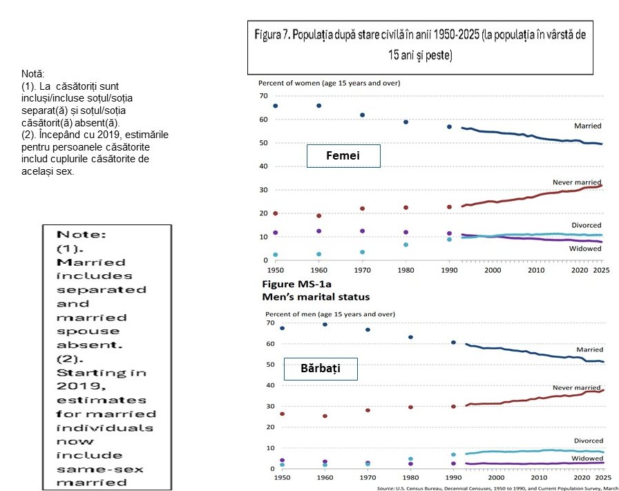Figura 7. Populația după stare civilă în perioada 1950-2025 (lpopulația în vârstă de 15 ani și peste) (https://www.census.gov/content/dam/Census/library/visualizations/time-series/demo/families-and-households/ms-1b.pdf).