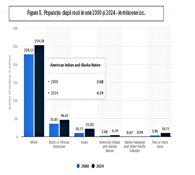 Figura 8. Populația după rasă în anii 2000 și 2024 – în milioane loc.(https://www.statista.com/statistics/183489/population-of-the-us-by-ethnicity-since-2000/).