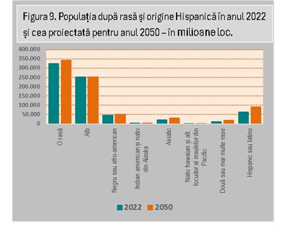 Figura 9. Populația SUA după rasă și origine Hispanică în anul 2022 și cea proiectată pentru anul 2050 – în milioane . (https://www.census.gov/data/tables/2023/demo/popproj/2023-summary-tables.html).