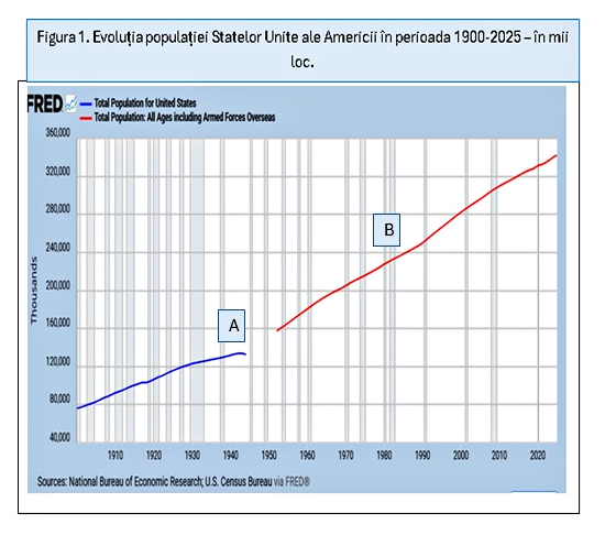 Figura 1. Evoluția populației Statelor Unite ale Americii în perioada 1900-2025 – în mii loc.