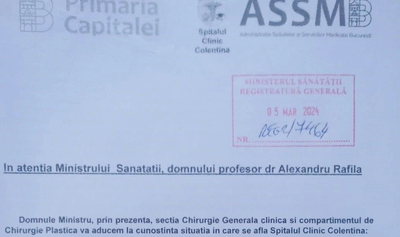 Secția Clinică Chirurgie Generală, secțiile Ortopedie 1 și Ortopedie 2, împreună cu compartimentul de Chirurgie Plastică din Spitalul Clinic Colentina adresează o scrisoare către ministrul Sănătății, Alexandru Rafila, pentru a atrage atenția asupra numeroaselor probleme cu care se confruntă instituția medicală.